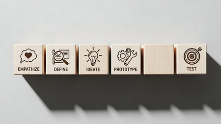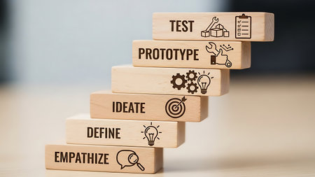 A vibrant workspace featuring a plant, colorful blocks, and yarn, accentuated by a light bulb symbolizing creativity and innovation, perfect for arts and crafts.