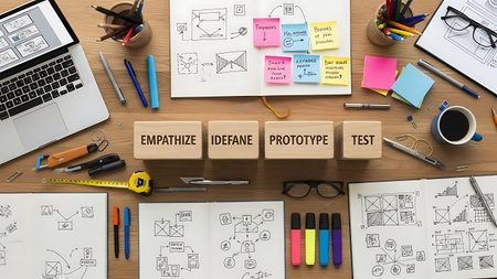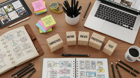 An organized workspace featuring sketches, digital devices, and creative tools used in mobile app design. The scene showcases the design process, highlighting brainstorming and planning with effective visual aids.