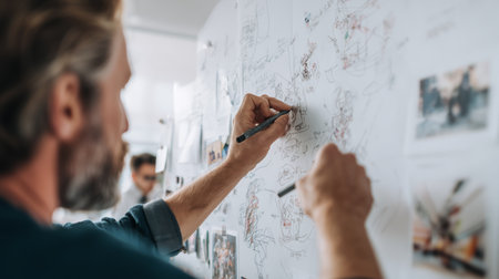 Creative process in a studio with artist drawing ideas on wall
