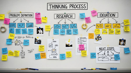 A whiteboard displaying a thinking process diagram with sticky notes, divided into problem definition, research, ideation, and next steps sections.