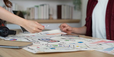 user experience UX designer designing web on smart phone layout. UI planning mobile application. developer work with business prototype