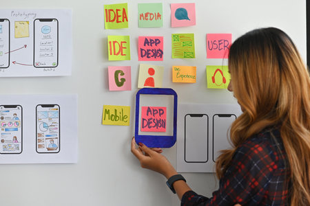 A vibrant and organized workspace showcasing wireframes and colorful sticky notes, perfect for UX designers and creative teams crafting innovative digital projects.