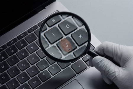 A gloved hand holds a magnifying glass over a computer keyboard to reveal a distinct fingerprint on a key as part of a forensic investigation into digital security and cybercrime evidence.