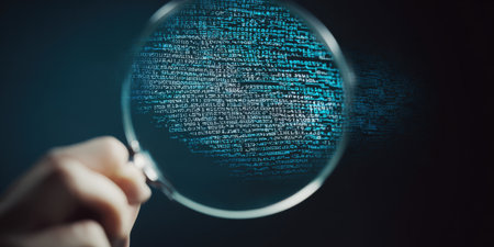 Hand holding a magnifying glass inspecting glowing blue abstract binary code and digital data. Representing concepts of cybersecurity. Data analysis. Software development. And online security research