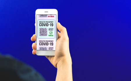 Vaccinated young man holds mobile phone with health passport application, concept for new normal and safe travels during COVID-19 pandemic, photo