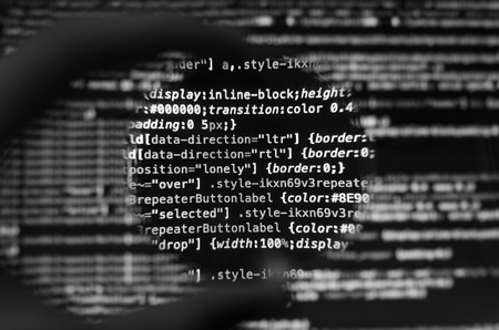 Real css code developing screen. Programing workflow abstract algorithm concept. Lines of css code visible under magnifying lens.