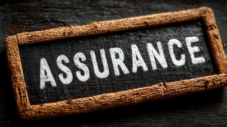 Chalkboard with the word assurance framed by wood, symbolizing reliability and protection.