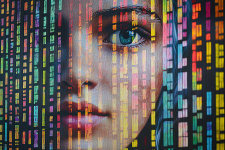 A human silhouette merges with genetic code, symbolizing the relationship between DNA and personal identity in genetics.