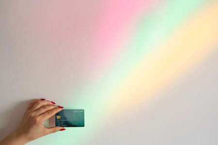 Bank payments. Online shopping. Personal offer. Financial operation. Female hand holding credit card on blur rainbow overlay glowing neon lights background.