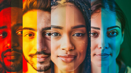Four diverse faces illuminated by vibrant, multicolored light, symbolizing unity and celebration during Pride Month.