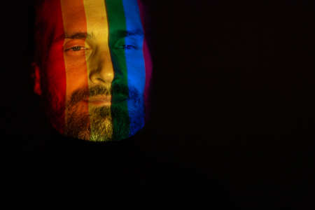 Rainbow Flag on face of adult man in dark.