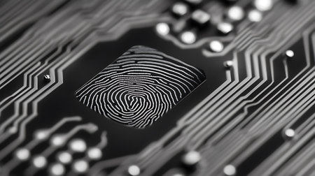 Illuminated digital fingerprint hologram hovers above a circuit board, symbolizing cybersecurity and biometric technology. The glowing lines represent data security and identity verification
