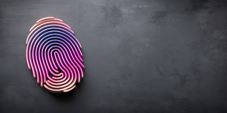 Neon fingerprint on dark textured surface glowing magenta and blue with modern cyber vibe