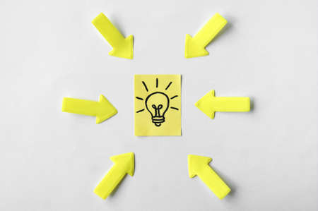 Pointing arrows indicate a sticker with a lamp, as a sign of a good idea. Concept of business, management, markets, creativity.