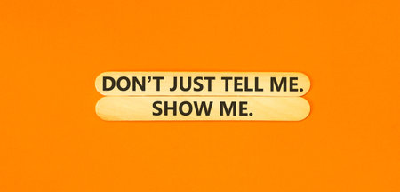 Tell or show symbol. Concept words Do not just tell me, show me beautiful wooden sticks. Beautiful orange background. Business tell or show concept. Copy space.