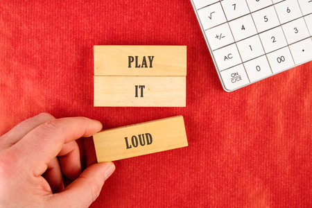 A hand holds wooden blocks that read play it loud on a bright red cloth. Nearby, a white grid suggests an organized game or artistic arrangement, creating a playful atmosphere.