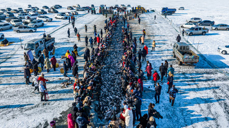 January 2, 2024, Jilin Province, China: The winter fishing in Chagan Lake has begun, and tourists stay on the ice to watch the spectacular scene of winter fishing in Chagan Lake.