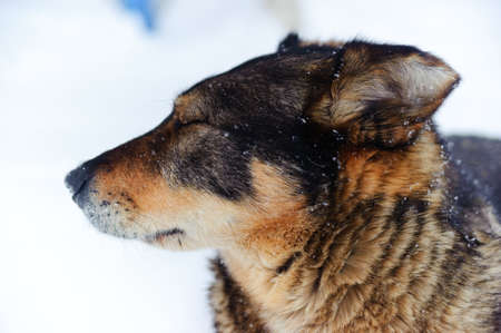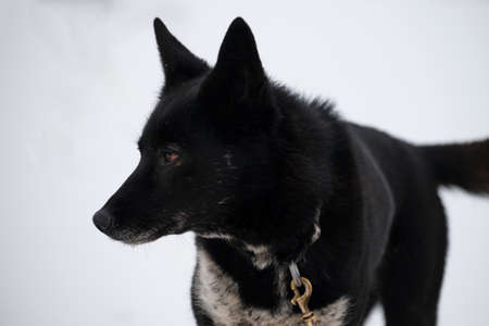 The northern sled dog breed is Alaskan Husky strong energetic and hardy. Black dog with gray muzzle portrait close up in profile against background of white snow in winter.