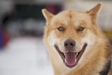 Close up of Happy and eager Alaskan husky sled dog with its tongue out. Ready for action on a cold winters day. High quality photo