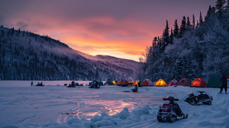 Winter Camping on a Frozen Lake During Sunset With Snowmobiles and Tents in a Remote Forested Area. Generative AI