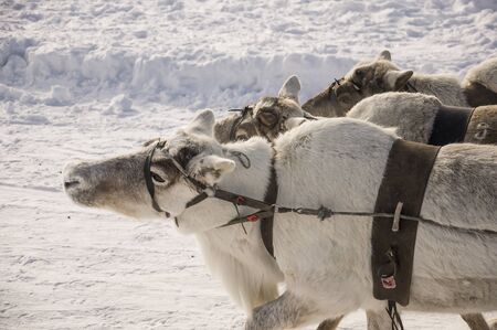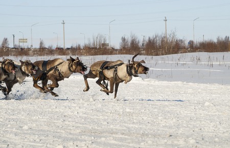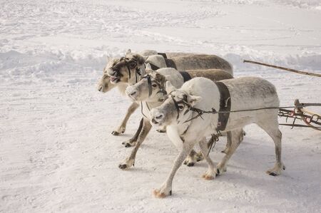 North deer are running on the snowy field track