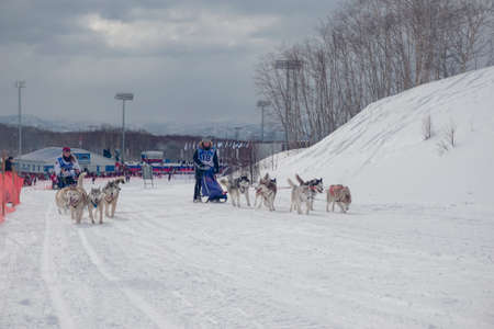 Petropavlovsk-Kamchatsky, Russia - February 22, 2021: Traditional dog sled race Beringia
