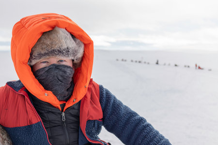 Adult caucasian male musher dressed in full arctic gear on snowy tundra landscape, facing extreme cold, in frozen wilderness, with dog sleds in background, Tarvantovaara Wilderness Area, Finland