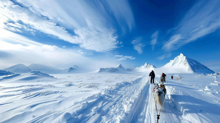 Frozen journey, person with sled of dogs traverses snowy antarctica, an epic adventure through icy landscapes with loyal canine companions, exploring the remote and pristine wildernes.