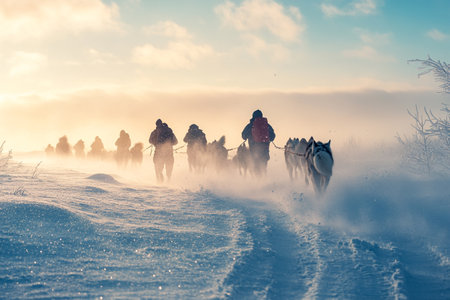 Sled dog team racing through snow at sunrise with golden light illuminating the trail in a winter wilderness setting
