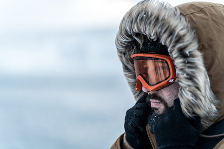 Headshot photo of a man in a cold snowy area wearing a thick brown winter jacket and gloves. Life in cold regions of the country.