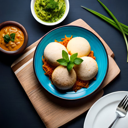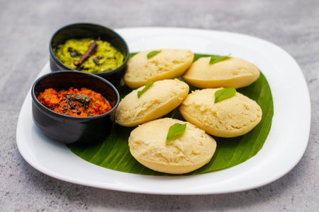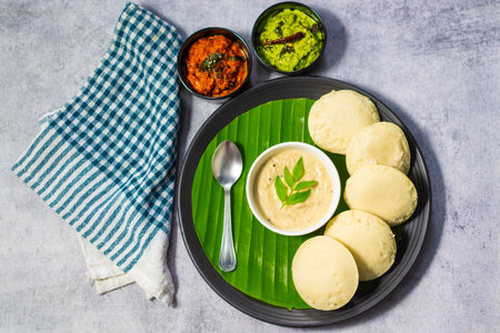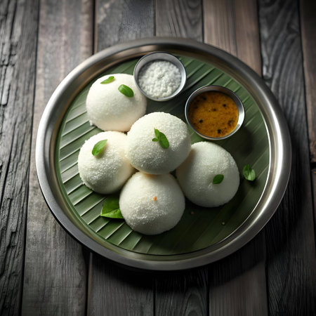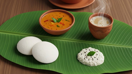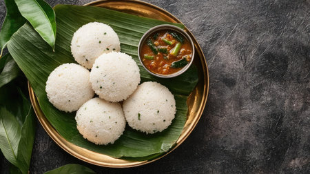 A mouthwatering still life of Idli. a popular South Indian breakfast dish. served with sambar and coconut chutney on a banana leaf. Perfect for illustrating food blogs. cookbooks. and restaurant menus.