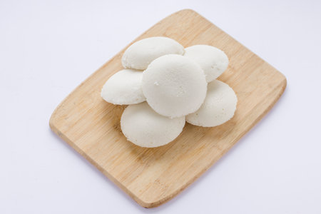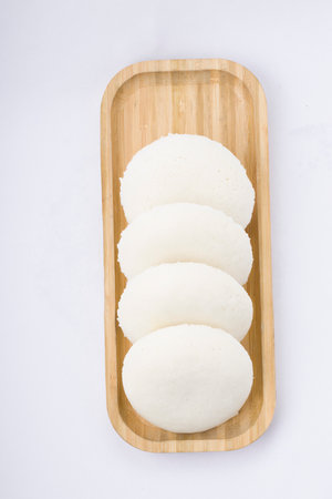 Idly or Idli, south indian main breakfast item which is beautifully arranged in awooden base placed on white background.