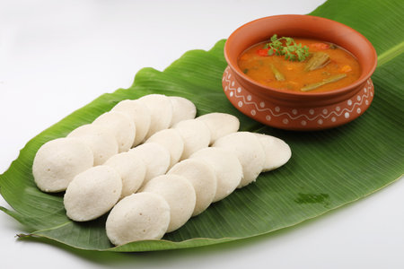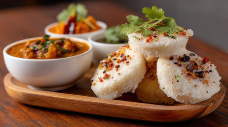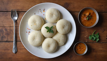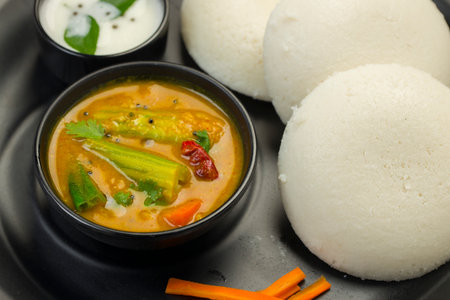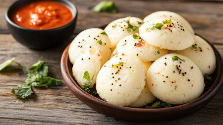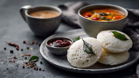 Close-up an appetizing depiction of idli and sambar, showcasing the quintessential South Indian breakfast combination, revered for its wholesome flavors and cultural significance