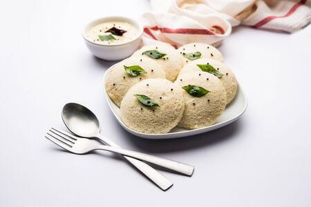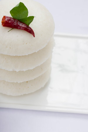 Idly or Idli, south indian main breakfast item garnished with red dry chilli and curry leaves which is beautifully arranged on white rectangle base on white textured background.