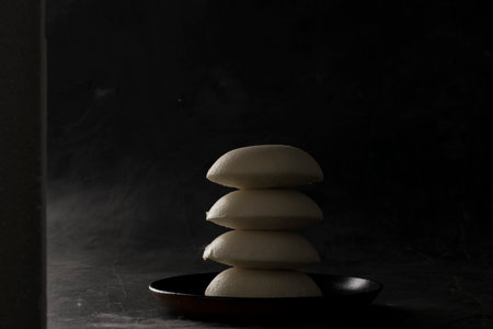 Idly or Idli, south indian main breakfast item which is placed in a heap one over other beautifully arranged in a black plate on dark green texture with kitchen background, selective focus.