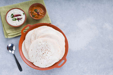 South Indian traditional breakfast Dosa or Thattu dosa made using cast iron dosa thawa, arranged in a tableware with side dish white coconut chutney and onion chutney on white textured background.