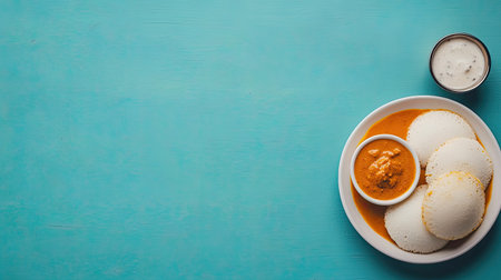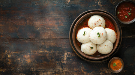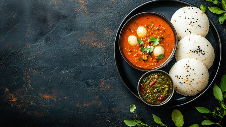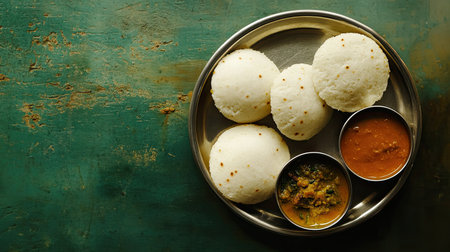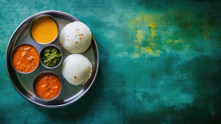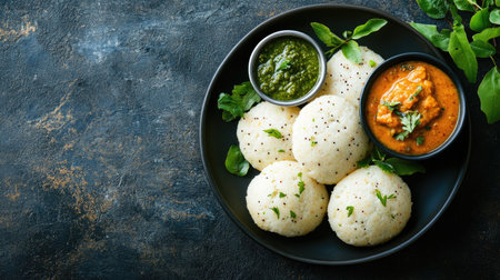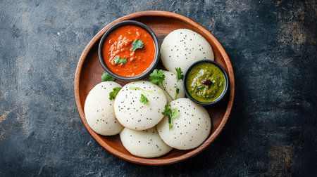 Top view of a traditional South Indian breakfast with idli, sambar, and chutney. Copy space available.