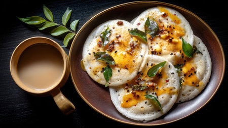 A mouthwatering presentation of traditional South Indian idli served with coconut chutney and a cup of hot tea. Perfect for breakfast.