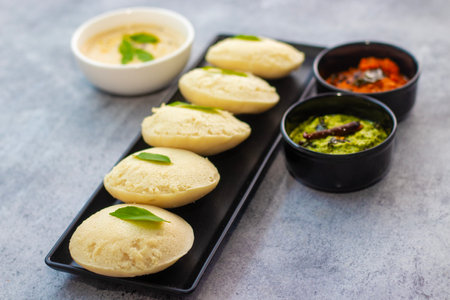 Rava idli served with chutney and sambar, a soft and fluffy breakfast option. Top view with copy space.