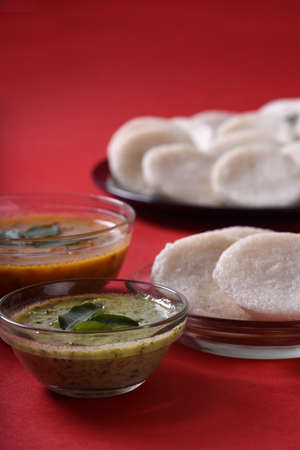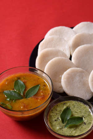 Idli with Sambar and coconut chutney on red background, Indian Dish : south Indian favourite food rava idli or semolina idly or rava idly, served with sambar and green chutney.