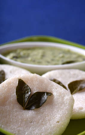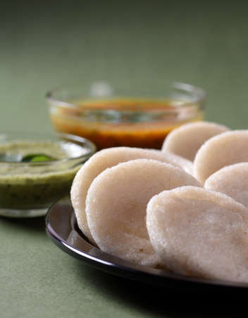 Indian Traditional Idli or Idul Fitri or Idli made using mung bean curd, served with green chutney. selective focus