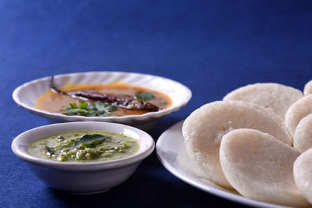 Idli with coconut chutney on blue background, Indian Dish : south Indian favourite food rava idli or semolina idly or rava idly, served with sambar and green coconut chutney.