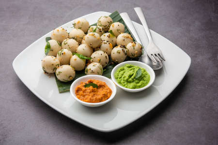 Soft and spongy Idli balls or goli idly with green and red chutney, south indian food recipe