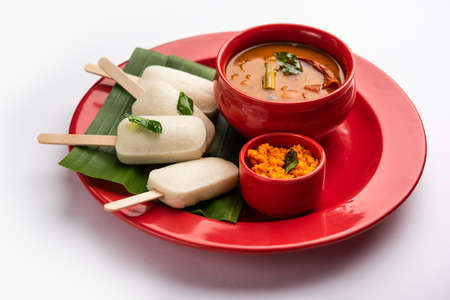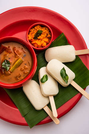 Idly lollipop or idli candy with stick served with sambar and chutney,South indian breakfast