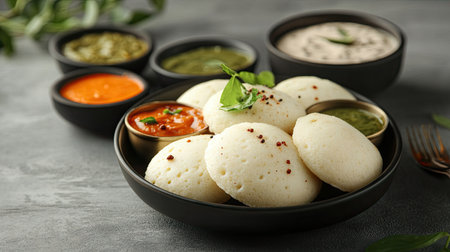 A vibrant presentation of idlis with assorted dips, set against a clean background that allows for ample space for promotional messages or branding.