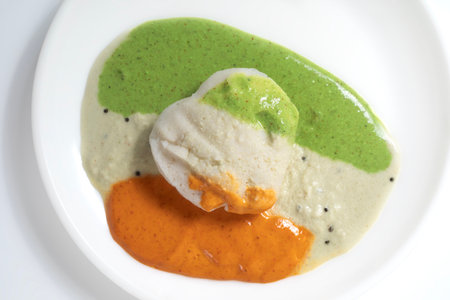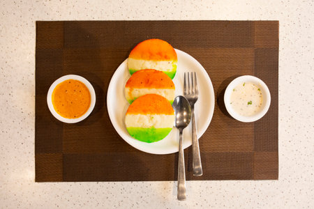 A white plate with soft idlis served with green, orange and white chutneys, arranged in a tri-color presentation. Perfect for a traditional Indian breakfast.