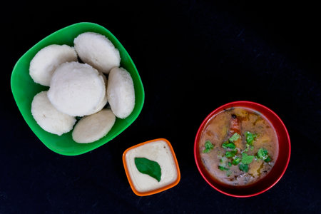 South Indian snacks idli sambar or idly sambhar prepared by steaming fermented rice and served with coconut dip and vegetable soup in a black tray. Top view.