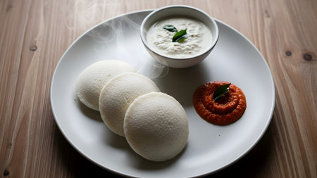 Indulge in traditional South Indian cuisine with freshly made idli served with tangy sambar and spicy chutney, all beautifully presented.