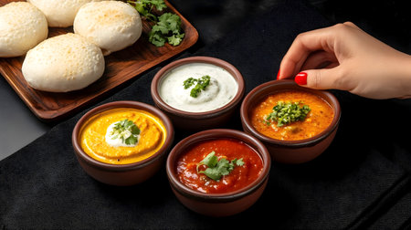 Hand reaching for Indian chutney bowls with idli on the side, showing traditional South Indian cuisine.