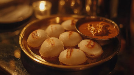 A delightful serving of fluffy idli accompanied by spicy sambar, beautifully presented and illuminated by soft candlelight, capturing the essence of traditional Indian dining.